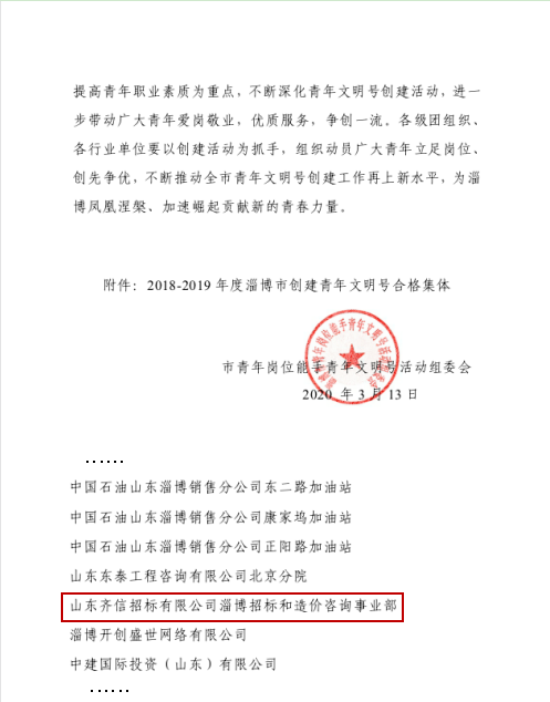 近日,共青團(tuán)淄博市委下發(fā)《2018-2019年度淄博市青年文明號(hào)創(chuàng)建情況通報(bào)》(淄青號(hào)發(fā)【2020】2號(hào)),山東齊信招標(biāo)有限公司淄博招標(biāo)采購與造價(jià)咨詢事業(yè)部榮獲淄博市“青年文明號(hào)”榮譽(yù)稱號(hào)。