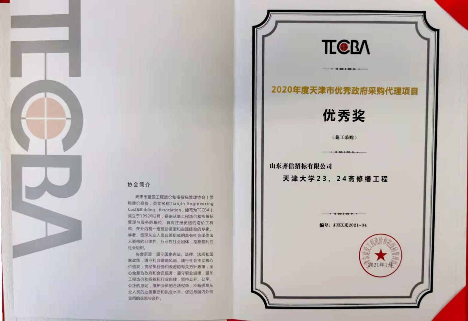 2021年1月,天津市建設工程造價和招投標管理協(xié)會公布2020年度天津市“優(yōu)秀招標代理項目”、“優(yōu)秀政府采購代理項目”,齊信天津分公司的“河北區(qū)數(shù)控機床廠地塊定向安置經濟適用房項目EPC工程總承包”入選優(yōu)秀招標代理項目,“天津大學23、24齋修繕工程”入選優(yōu)秀政府采購代理項目。